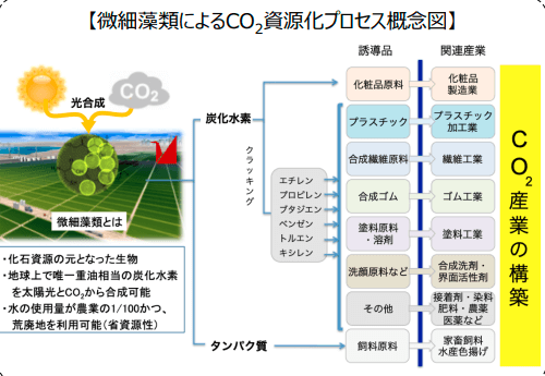 太陽エネルギーを用いた微細藻類から炭化水素を生産する技術や、微細藻類からの炭化水素を回収する技術などを開発しており、2050年には開発したプロセスを用いて製品を製造した場合、約1,000万トンの二酸化炭素削減効果が見込まれています。