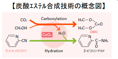 高性能プラスチック(ポリカーボネート)の原料やリチウム電池に使用される炭酸エステルは、従来、猛毒のホスゲンを用いて製造されてきました。 そこで、本技術では、触媒と脱水剤の存在下でCO₂をアルコールと反応させ、炭酸エステルに変換するプロセスを確立しました。
