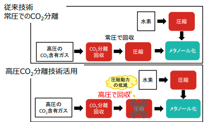 さらに、CO₂の圧縮動力を削減することで、従来よりも効率的な化成品合成を実現しています。本技術を活用することで、年間50万トンのCO₂削減が見込まれており、国内メタノール需要の一部を代替できる可能性があります。