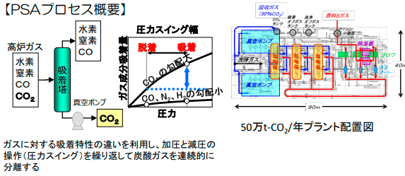 JFLスチール株式会社は、製鉄所の高炉から排出されるCO₂の分離回収技術の開発に取り組んでいます。 革新的製鉄プロセス「COURSE50」の一環として、PSA(圧力スイング吸着)法を活用したCO₂分離回収の実用化を進めています。
