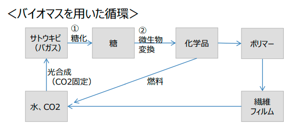 また、水処理分離膜技術を活用し、高品質な化学品の製造とエネルギー消費の削減を実現しました。バイオマスはCO₂と水を原料に成長するため、カーボンニュートラルの特性を持ち、大気中のCO₂を増加させません。