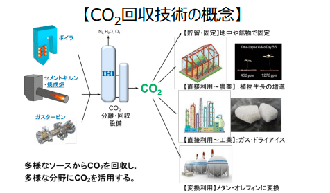 株式会社IHIでは、化石燃料を燃料とする火力発電所や、化石燃料を原料とする化学プロセス、廃棄物処理施設などで排出されるCO₂の削減に取り組んでおり、カーボンリサイクルの実現に向けて、プラントから排出されるCO₂を効率的に回収する技術の最適化や安全性の確認を進め、実用化を目指しています。