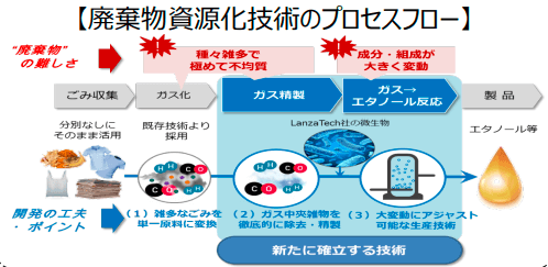 このプロセスでは、廃棄物をガス化してCO/H₂を生成し、微生物のガス発酵を活用してエタノールなどの資源を合成 します。さらに、副生するCO₂をグリーン水素でCOに転換し、エタノールからエチレンやブタジエンを合成する技術の開発も進めていま