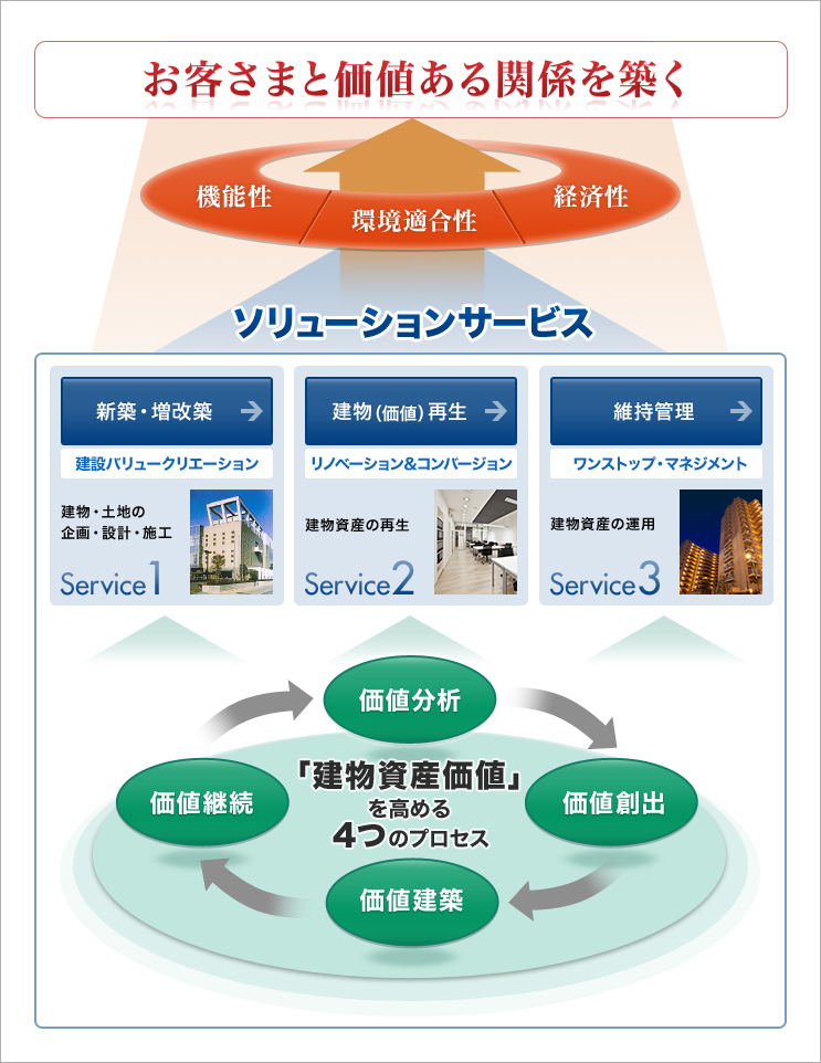 私たちは、建設サービス業として、建物の新築・増改築、建物(価値)再生、維持管理の3つのサービス領域にて、お客さまの建物資産価値を高める建設ソリューションを展開しています。 建物の「機能性」や「経済性」の視点はもとより「環境適合性」や「持続可能性」などの高度化する社会のニーズにも応えながら、建物資産価値の分析、創出、建築、継続の4つのプロセスを踏みながら、お客さまの建物資産の最適価値を追求していきます。